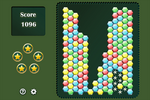 Bricks Breaking Hex - Version 1.2.0 In this game there will be a grid of hexagonal bricks and you need to destroy them. You can destroy a brick simply by clicking on it. Each time you destroy a brick, the adjacent bricks of the same colour will also be destroyed. If there aren't any adjacent bricks of the same colour, then you can only destroy that single brick and you will lose a star. If you run out of stars then you will no longer be able to remove single bricks. If there are only single bricks left and you have used all your stars, then the game is over. You can score higher if you can remove a large number of bricks at one time.