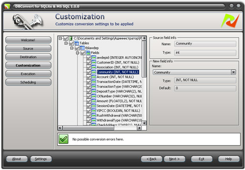 DBConvert for SQLite and MSSQL - Version 1.0.0 DBConvert for SQLite and MS SQL is a database migration tool which performs two-way conversion from SQLite databases to MS SQL server and from MS SQL to SQLite. The tool is also applicable for MS SQL database migration to another MS SQL database or to MS SQL server and is quite adept at copying a SQLite database to another SQLite database.DBConvert for SQLite and MS SQL provides the bulk of functional capabilities such as interactive (GUI) mode/command line mode, saving data into a MS SQL Dump for export to MS SQL database, task planner scheduling, data mapping, data filtering, preverification of possible conversion errors, etc.You can convert SQLite to MS SQL or MS SQL to SQLite simply by configuring several options through a Wizard interface or in command line mode. Command line parameters added to a scheduling function enables you to automatically synchronize or convert data regularly without user input and supplementary settings.DBConvert for SQLite and MS SQL provides you with the ability to create Dumps for indirect data uploading on MS SQL thereby offering a workaround to possible server restrictions.Data mapping is a compatible data types assignment for a destination database. This function used as an additional ability for data population makes your conversion more flexible.Filtering data during conversion allows users to retrieve only specific data for converted tables according to defined filtering criteria. Filters give you more control on the data migration process.Possible conversion errors can be detected before the conversion process gets started. The tool displays errors and potential problems with your table objects beforehand.