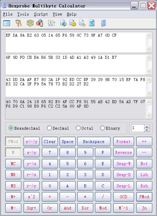 Hpmbcalc Hex Calculator - Version 4.21 This is a programmable multiple-precision hex calculator with many utilities. With Hpmbcalc, you can easily perform a lot of big number math and encryption operations, such as: square root, modular inverse; hash, CRC, and check sum make; shift register configuration evaluation and simulationl; pseudo-random number generation; primality test; hex, dec, oct, bin conversions; etc.