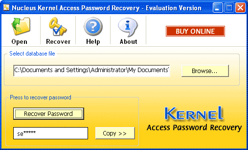 Kernel Access Password Recovery Software - Version 4.02 Kernel Access Password Recovery tool is a MicrosoftAccess MDB password recovery software designed torecover lost and forgotten passwords from MicrosoftAccess Database (.mdb) files. Kernel Access PasswordRecovery software quickly recovers password of mdb fileirrespective of the password length and complexity. Kernel Access Password Recovery software uses quickalgorithm for recovering the lost password and hence isa fast, simple and easy to use Access Password RecoverySoftware, which helps you to recover your lost andforgotten password in minutes. Kernel Access DatabasePassword Recovery, MDB Password recovery softwaresupported versions includes Access 2003, Access 2002,Access 2000, Access 97 files. Free demo version of the software displays twocharacters of the recovered password. However, if youpurchase full version of the software, you get completerecovery of password.