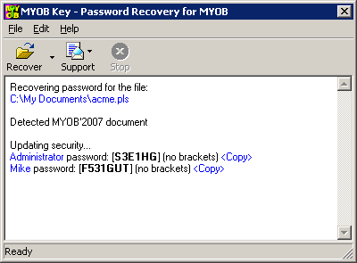 MYOB Password Recovery Key - Version 6.5 MYOB Password Recovery Key recovers passwords for MYOB Data files (.PLS). This product supports all versions of MYOB including 2004. All passwords are recovered instantly. The software is easy to use - drag and drop the file to the program window to recover the password. Download a free version now!