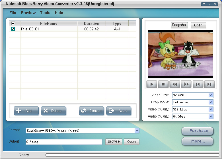 Nidesoft BlackBerry Video Converter - Version 2.5.12 Nidesoft BlackBerry Video Converter is powerful and wonderful Movie Converter for BlackBerry series mobile phone. It could convert video and audio files to your BlackBerry movie and music format.The source files formats that could be converted by this BlackBerry Video Converter include: MPEG, VOB, MP4, M4V, WMV, ASF, AVI, 3GP, FLV, YouTube, etc.. Additionally, you could use this BlackBerry Converter to convert MOD to BlackBerry video.Morever, this BlackBerry Movie Converter could support all the BlackBerry family, such as BlackBerry Curve, Pearl and even the new released Storm. Additionally, it also provide many profiles to support other devices including iPod, iPhone, Google G1 and so on. Nidesoft BlackBerry Video Converter has strong function and rich settings for video output. You could set the Video Quality, Video Resolution and Crop Mode to stretch the picture. You could also edit the output video files with your Movie Maker in Windows after conversion to get more effect.