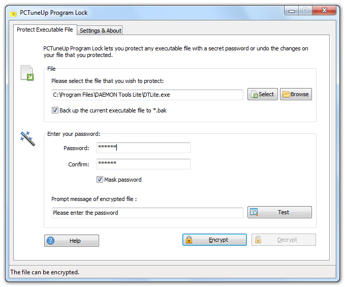 PCTuneUp Free EXE Lock - Version 5.0.3 PCTuneUp Free EXE Lock is a powerful yet easy to use system utility that enables you to lock any Windows executable applications in few steps, like games, web browsers, tax preparation software, etc. It is designed for people who want to protect their sensitive programs from an unauthorized usage whenever sharing the same computer with others. The locked files will stay protected even when you copy them to another computer whatever operating system this computer runs - only accessible to the one who enters the correct passwords.This professional free application lock provides double privacy protection. It manages to password protect any other executable programs as well as be added passwords to itself, thus there is no possibility for others to try to run or uninstall it without your permission, let alone fully launching your protected applications.PCTuneUp Free EXE Lock provides ability to create a